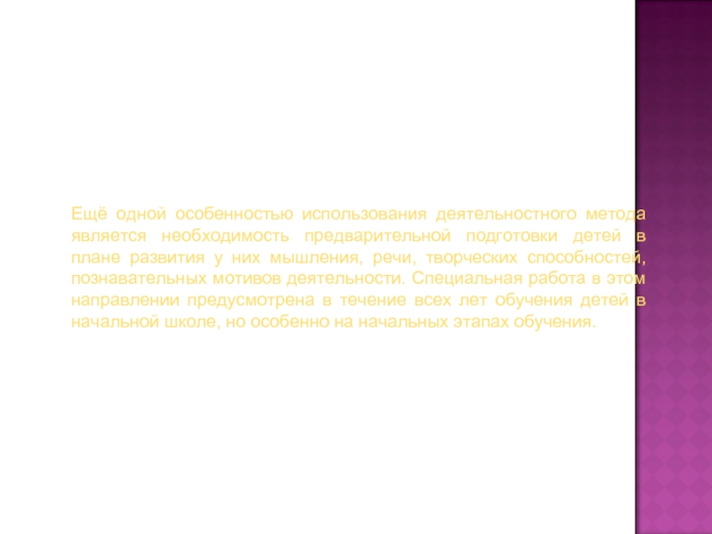 Слайд 5Ещё одной особенностью использования деятельностного метода является необходимость предварительной подготовки детей