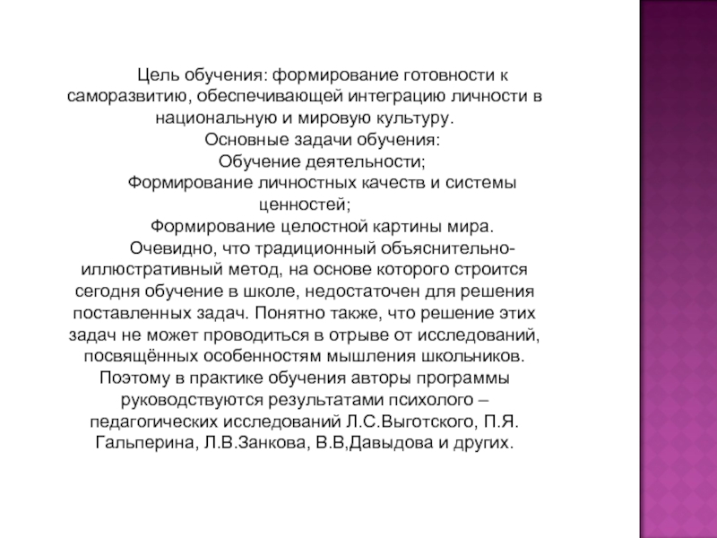 Очевидно, что традиционный объяснительно- иллюстративный метод, на основе которого строится сегодня обучение в школе, недостаточен для решения поставленных задач. Понятно также, что решение этих задач не может проводиться в отрыве от исследований, посвящённых особенностям мышления школьников. Поэтому в практике обучения авторы программы руководствуются результатами психолого – педагогических исследований Л.С.Выготского, П.Я.Гальперина, Л.В.Занкова, В.В,Давыдова и других.