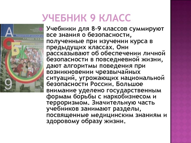 полученные при изучении курса в предыдущих классах. Они рассказывают об обеспечении личной безопасности в повседневной жизни, дают алгоритмы поведения при возникновении чрезвычайных ситуаций, угрожающих национальной безопасности России. Большое внимание уделено государственным формам борьбы с наркобизнесом и терроризмом. Значительную часть учебников занимают разделы, посвященные медицинским знаниям и здоровому образу жизни.