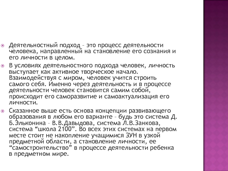 Слайд 3Деятельностный подход – это процесс деятельности человека, направленный на становление его
