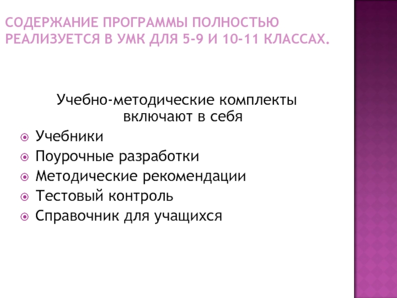 Слайд 18СОДЕРЖАНИЕ ПРОГРАММЫ ПОЛНОСТЬЮ РЕАЛИЗУЕТСЯ В УМК ДЛЯ 5-9 И 10-11 КЛАССАХ.