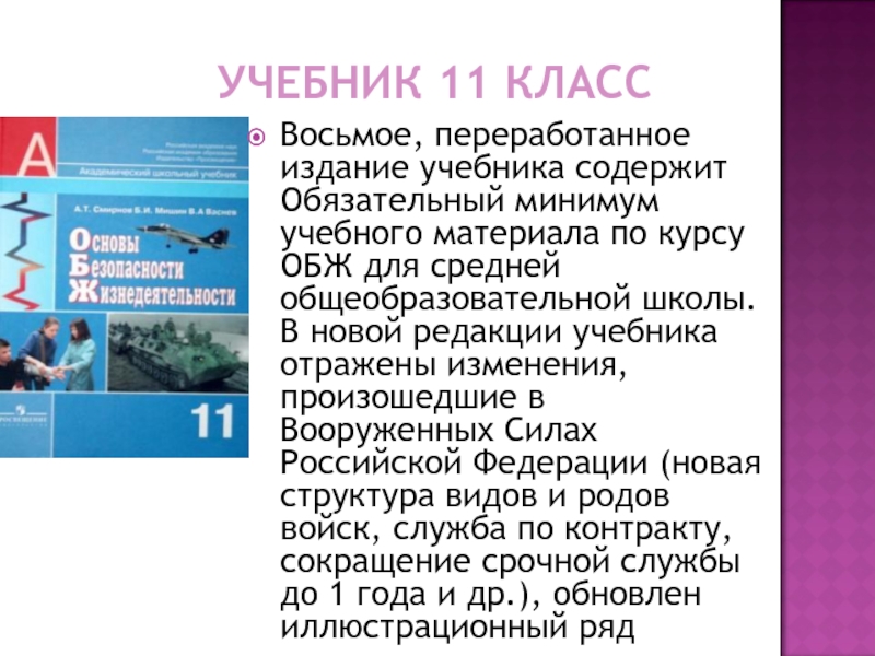 по курсу ОБЖ для средней общеобразовательной школы. В новой редакции учебника отражены изменения, произошедшие в Вооруженных Силах Российской Федерации (новая структура видов и родов войск, служба по контракту, сокращение срочной службы до 1 года и др.), обновлен иллюстрационный ряд