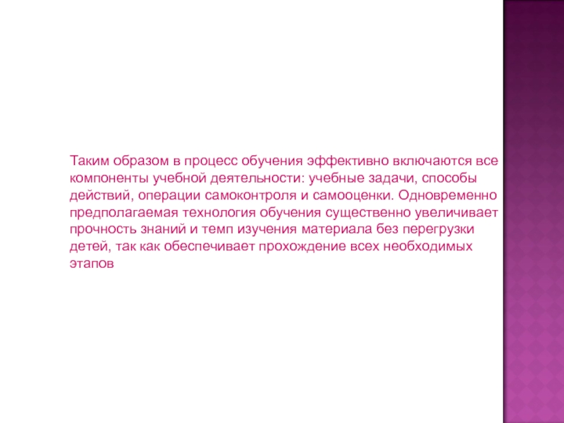 учебные задачи, способы действий, операции самоконтроля и самооценки. Одновременно предполагаемая технология обучения существенно увеличивает прочность знаний и темп изучения материала без перегрузки детей, так как обеспечивает прохождение всех необходимых этапов