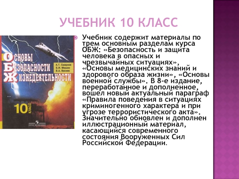 «Безопасность и защита человека в опасных и чрезвычайных ситуациях», «Основы медицинских знаний и здорового образа жизни», «Основы военной службы». В 8-е издание, переработанное и дополненное, вошел новый актуальный параграф «Правила поведения в ситуациях криминогенного характера и при угрозе террористического акта». Значительно обновлен и дополнен иллюстрационный материал, касающийся современного состояния Вооруженных Сил Российской Федерации.