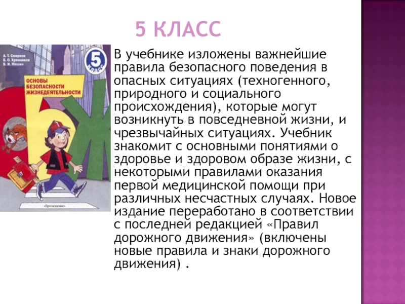 (техногенного, природного и социального происхождения), которые могут возникнуть в повседневной жизни, и чрезвычайных ситуациях. Учебник знакомит с основными понятиями о здоровье и здоровом образе жизни, с некоторыми правилами оказания первой медицинской помощи при различных несчастных случаях. Новое издание переработано в соответствии с последней редакцией «Правил дорожного движения» (включены новые правила и знаки дорожного движения) .