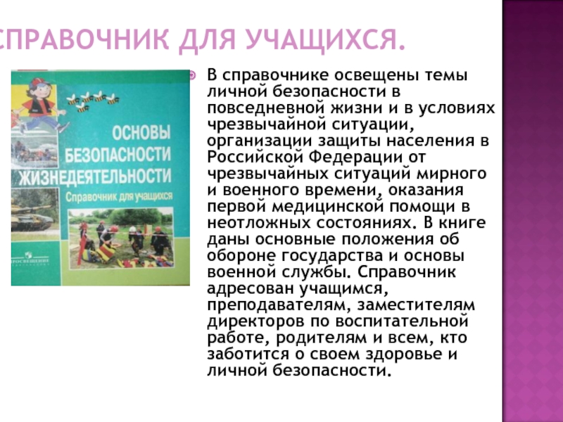 характера (геологического, метеорологического, гидрологического и биологического происхождения) и излагает правила поведения в таких ситуациях. Большое внимание уделено вопросам воспитания психологической уравновешенности, взаимодействия подростка с окружающими людьми. Тема первой медицинской помощи представлена практическими занятиями.