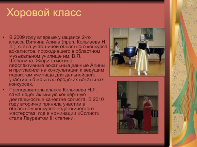 Преподаватель класса Кольгаева Н.Л. сама ведет активную концертную деятельность в качестве солиста. В 2010 году вторично приняла участие в областном конкурсе педагогического мастерства, где в номинации «Солист» стала Лауреатом III степени.