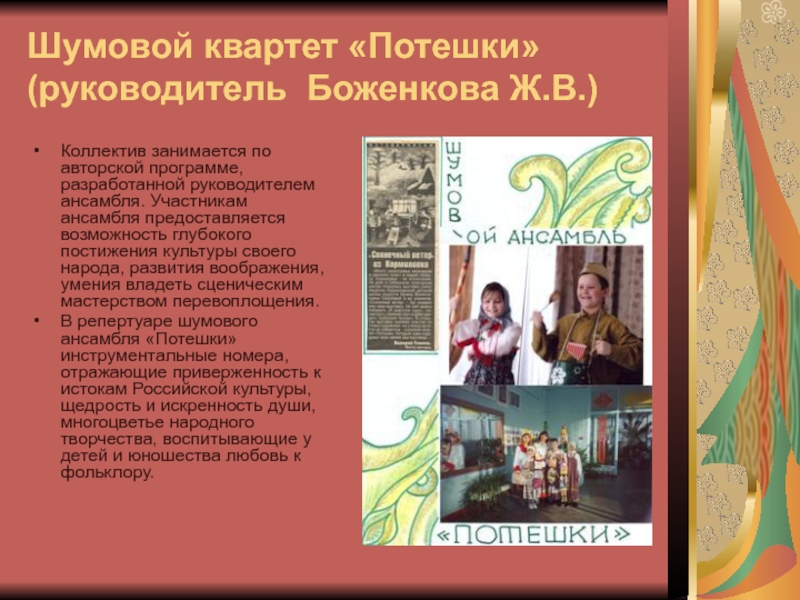 ансамбля. Участникам ансамбля предоставляется возможность глубокого постижения культуры своего народа, развития воображения, умения владеть сценическим мастерством перевоплощения.