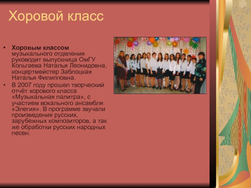 Хоровым классом музыкального отделения руководит выпускница ОмГУ Кольгаева Наталья Леонидовна,
