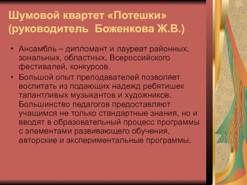 Большой опыт преподавателей позволяет воспитать из подающих надежд ребятишек талантливых музыкантов и художников. Большинство педагогов предоставляют учащимся не только стандартные знания, но и вводят в образовательный процесс программы с элементами развивающего обучения, авторские и экспериментальные программы.