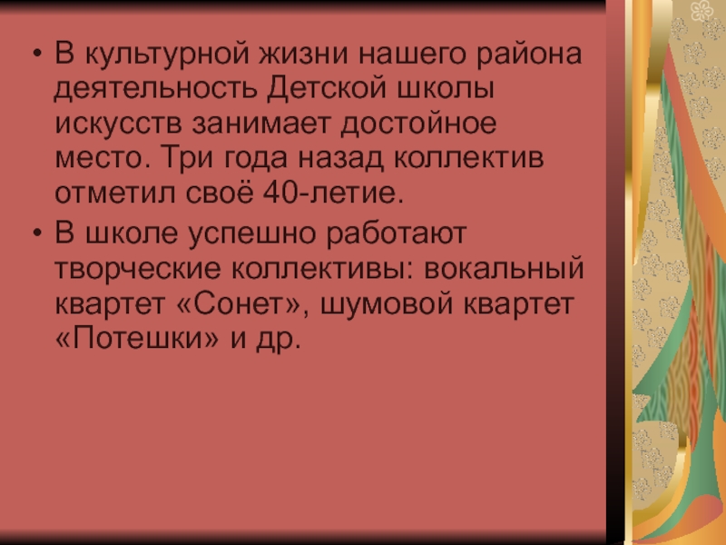 Слайд 2В культурной жизни нашего района деятельность Детской школы искусств занимает достойное