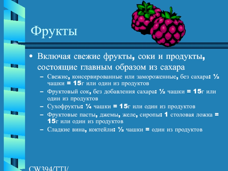 Фруктовый сок, без добавления сахара: ½ чашки = 15г или один из продуктов