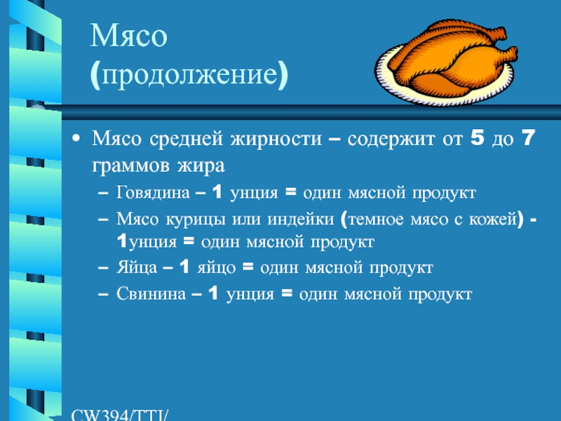 Мясо курицы или индейки (темное мясо с кожей) - 1унция = один мясной продукт
