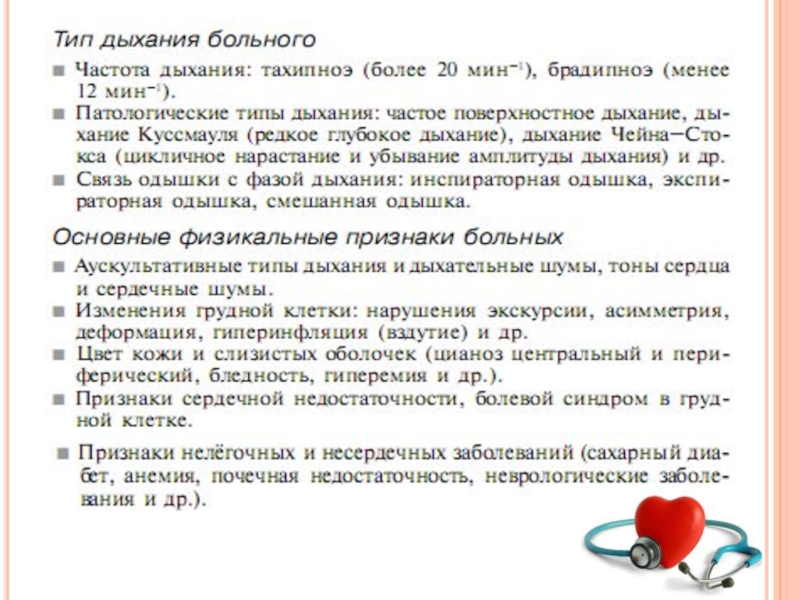 заболевания органов дыхания и сердечно-сосудистой системы. Различают острую одышку ,развивающуюся от нескольких минут до часа, подострую – до нескольких дней, и хроническую одышку - продолжительностью до нескольких лет.