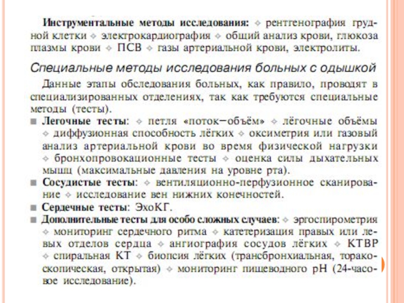 Несмотря на то что причиной одышки может быть огромное число заболеваний, более двух третей всех случаев, как правило, связано либо с респираторными, либо с сердечными заболеваниями. Обследование больного с одышкой (кроме сбора анамнеза и осмотра больного, выполнения некоторых рутинных диагностических тестов) нередко требует использования довольно сложных и дорогостоящих методов диагностики.