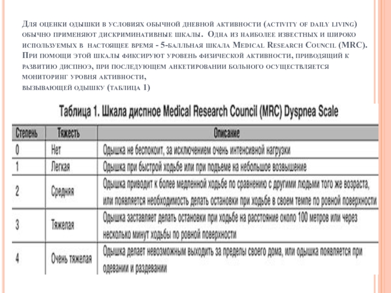 living) обычно применяют дискриминативные шкалы. Одна из наиболее известных и широко используемых в настоящее время - 5-балльная шкала Medical Research Council (MRC). При помощи этой шкалы фиксируют уровень физической активности, приводящий к развитию диспноэ, при последующем анкетировании больного осуществляется мониторинг уровня активности,