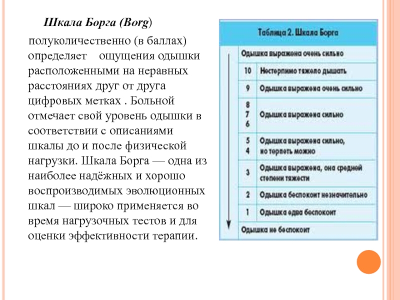 определяет ощущения одышки расположенными на неравных расстояниях друг от друга цифровых метках . Больной отмечает свой уровень одышки в соответствии с описаниями шкалы до и после физической нагрузки. Шкала Борга — одна из наиболее надёжных и хорошо воспроизводимых эволюционных шкал — широко применяется во время нагрузочных тестов и для оценки эффективности терапии.