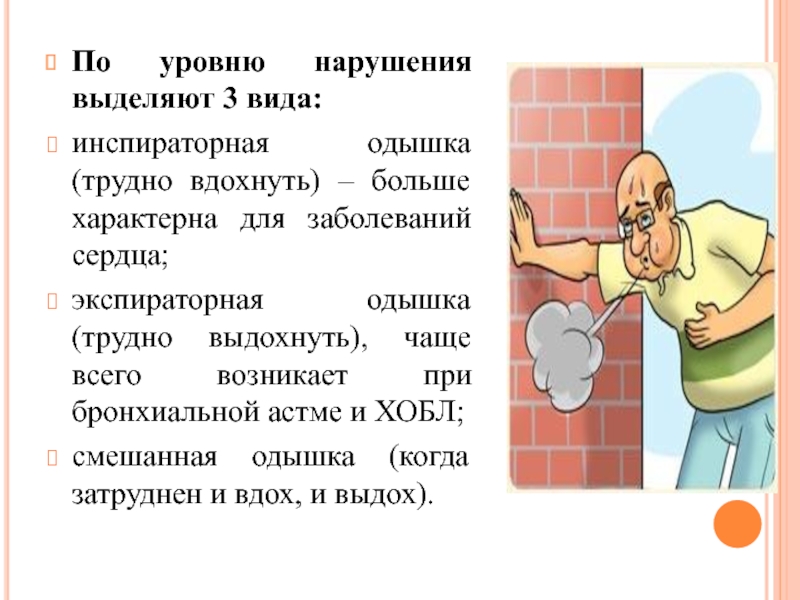 экспираторная одышка (трудно выдохнуть), чаще всего возникает при бронхиальной астме и ХОБЛ;
