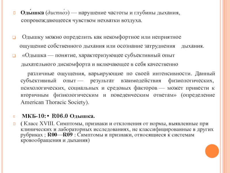 различные ощущения, варьирующие по своей интенсивности. Данный субъективный опыт — результат взаимодействия физиологических, психологических, социальных и средовых факторов — может привести к вторичным физиологическим и поведенческим ответам» (определение American Thoracic Society).