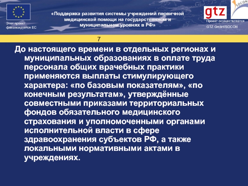 До настоящего времени в отдельных регионах и муниципальных образованиях в оплате труда персонала общих врачебных практики применяются выплаты стимулирующего характера: «по базовым показателям», «по конечным результатам», утверждённые совместными приказами территориальных фондов обязательного медицинского страхования и уполномоченными органами исполнительной власти в сфере здравоохранения субъектов РФ, а также локальными нормативными актами в учреждениях.
