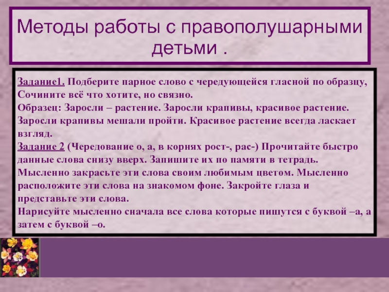Задание 2 (Чередование о, а, в корнях рост-, рас-) Прочитайте быстро данные слова снизу вверх. Запишите их по памяти в тетрадь. Мысленно закрасьте эти слова своим любимым цветом. Мысленно расположите эти слова на знакомом фоне. Закройте глаза и представьте эти слова.
