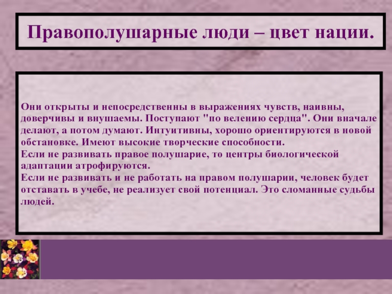 2. Правополушарные (доминирует правое полушарие) имеют конкретно образное мышление и развитое воображение.