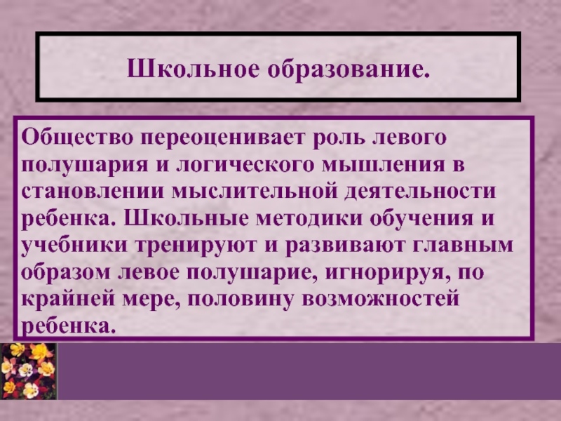 мыслительной деятельности ребенка. Школьные методики обучения и учебники тренируют и развивают главным образом левое полушарие, игнорируя, по крайней мере, половину возможностей ребенка.