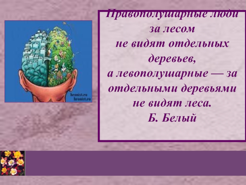 1.Левополушарные (доминирование левого полушария) имеют словесно логический характер