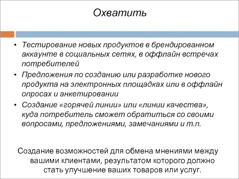 5. Охватить. Привлечение потребителей к участию в деятельности компании, например в разработке новых продуктов...