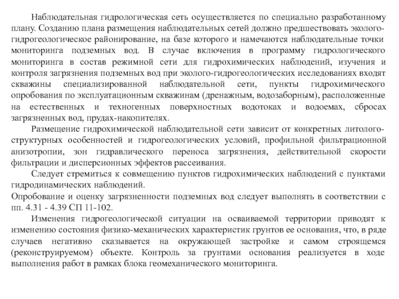 наблюдательных сетей должно предшествовать эколого-гидрогеологическое районирование, на базе которого и намечаются наблюдательные точки мониторинга подземных вод. В случае включения в программу гидрологического мониторинга в состав режимной сети для гидрохимических наблюдений, изучения и контроля загрязнения подземных вод при эколого-гидрогеологических исследованиях входят скважины специализированной наблюдательной сети, пункты гидрохимического опробования по эксплуатационным скважинам (дренажным, водозаборным), расположенные на естественных и техногенных поверхностных водотоках и водоемах, сбросах загрязненных вод, прудах-накопителях.