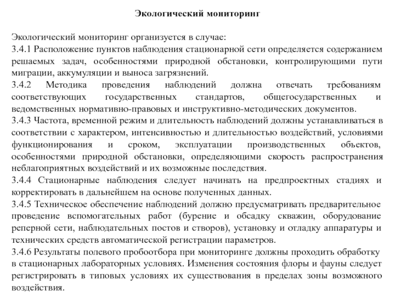 3.4.3 Частота, временной режим и длительность наблюдений должны устанавливаться в соответствии с характером, интенсивностью и длительностью воздействий, условиями функционирования и сроком, эксплуатации производственных объектов, особенностями природной обстановки, определяющими скорость распространения неблагоприятных воздействий и их возможные последствия.