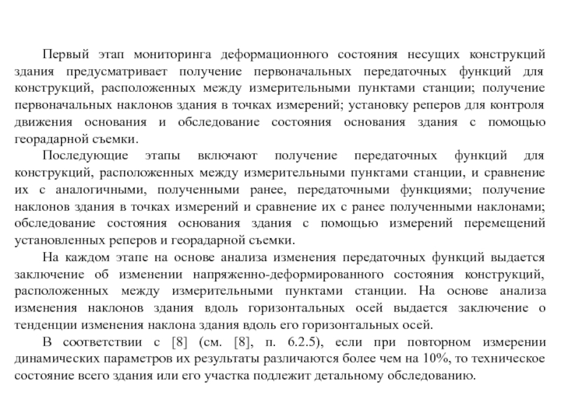 В соответствии с [8] (см. [8], п. 6.2.5), если при повторном измерении динамических параметров их результаты различаются более чем на 10%, то техническое состояние всего здания или его участка подлежит детальному обследованию.