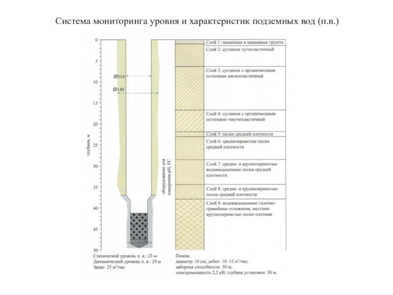 Слайд 8Система мониторинга уровня и характеристик подземных вод (п.в.)