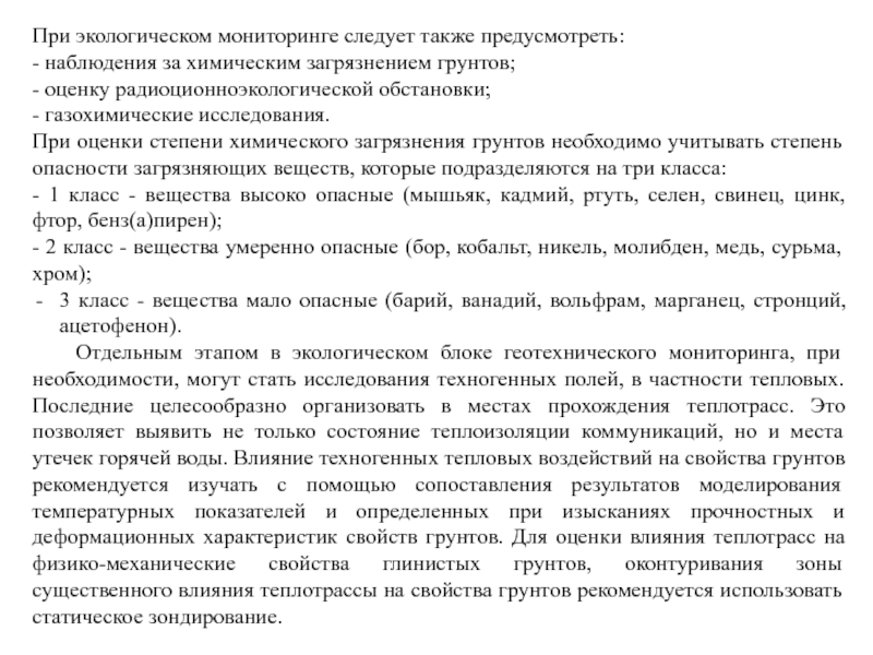 Отдельным этапом в экологическом блоке геотехнического мониторинга, при необходимости, могут стать исследования техногенных полей, в частности тепловых. Последние целесообразно организовать в местах прохождения теплотрасс. Это позволяет выявить не только состояние теплоизоляции коммуникаций, но и места утечек горячей воды. Влияние техногенных тепловых воздействий на свойства грунтов рекомендуется изучать с помощью сопоставления результатов моделирования температурных показателей и определенных при изысканиях прочностных и деформационных характеристик свойств грунтов. Для оценки влияния теплотрасс на физико-механические свойства глинистых грунтов, оконтуривания зоны существенного влияния теплотрассы на свойства грунтов рекомендуется использовать статическое зондирование.