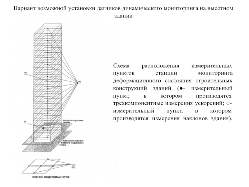 Слайд 3Вариант возможной установки датчиков динамического мониторинга на высотном здании