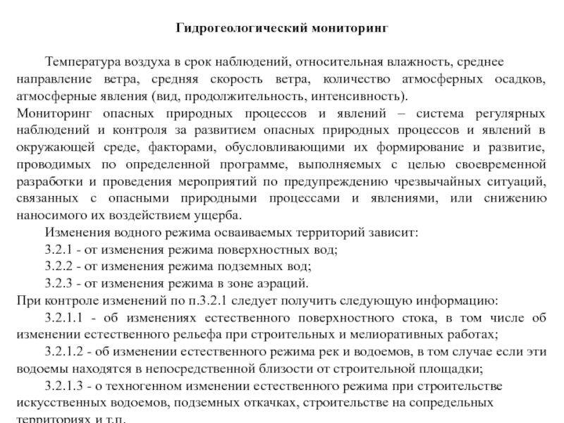Мониторинг опасных природных процессов и явлений – система регулярных наблюдений и контроля за развитием опасных природных процессов и явлений в окружающей среде, факторами, обусловливающими их формирование и развитие, проводимых по определенной программе, выполняемых с целью своевременной разработки и проведения мероприятий по предупреждению чрезвычайных ситуаций, связанных с опасными природными процессами и явлениями, или снижению наносимого их воздействием ущерба.