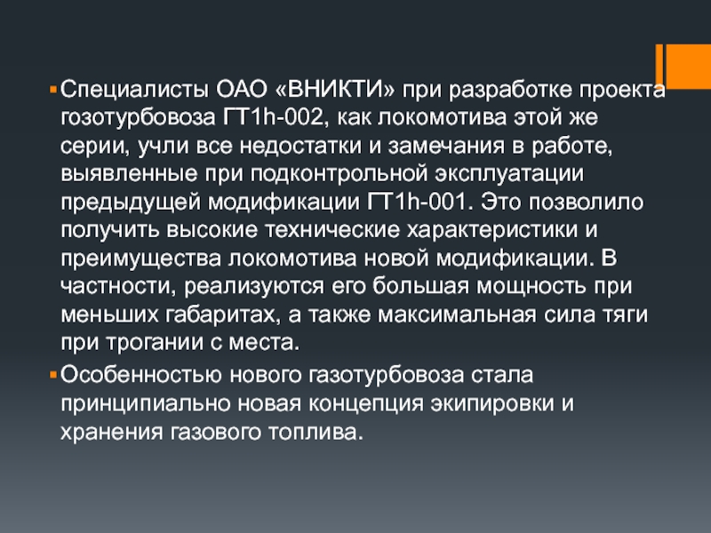 Слайд 13Специалисты ОАО «ВНИКТИ» при разработке проекта гозотурбовоза ГТ1h-002, как локомотива этой