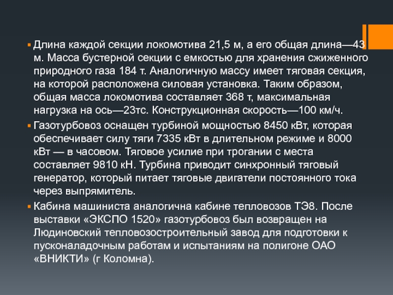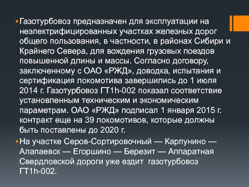 Слайд 15Газотурбовоз предназначен для эксплуатации на неэлектрифицированных участках железных дорог общего пользования,