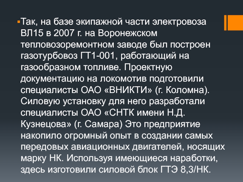 Воронежском тепловозоремонтном заводе был построен газотурбовоз ГТ1-001, работающий на газообразном топливе. Проектную документацию на локомотив подготовили специалисты ОАО «ВНИКТИ» (г. Коломна). Силовую установку для него разработали специалисты ОАО «СНТК имени Н.Д. Кузнецова» (г. Самара) Это предприятие накопило огромный опыт в создании самых передовых авиационных двигателей, носящих марку НК. Используя имеющиеся наработки, здесь изготовили силовой блок ГТЭ 8,3/НК.
