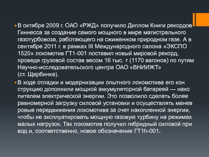 за создание самого мощного в мире магистрального газотурбовоза, работающего на сжиженном природном газе. А в сентябре 2011 г. в рамках III Международного салона «ЭКСПО 1520» локомотив ГТ1-001 поставил новый мировой рекорд, проведя грузовой состав весом 16 тыс. т (1170 вагонов) по путям Научно-исследовательского центра ОАО «ВНИИЖТ» (ст. Щербинка).