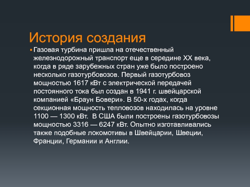 XX века, когда в ряде зарубежных стран уже было построено несколько газотурбовозов. Первый газотурбовоз мощностью 1617 кВт с электрической передачей постоянного тока был создан в 1941 г. швейцарской компанией «Браун Бовери». В 50-х годах, когда секционная мощность тепловозов находилась на уровне 1100 — 1300 кВт. В США были построены газотурбовозы мощностью 3316 — 6247 кВт. Опытно изготавливались также подобные локомотивы в Швейцарии, Швеции, Франции, Германии и Англии.
