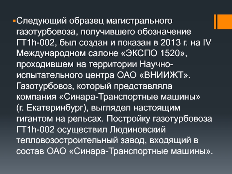 в 2013 г. на IV Международном салоне «ЭКСПО 1520», проходившем на территории Научно-испытательного центра ОАО «ВНИИЖТ». Газотурбовоз, который представляла компания «Синара-Транспортные машины» (г. Екатеринбург), выглядел настоящим гигантом на рельсах. Постройку газотурбовоза ГТ1h-002 осуществил Людиновский тепловозостроительный завод, входящий в состав ОАО «Синара-Транспортные машины».