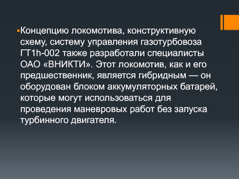 Слайд 10Концепцию локомотива, конструктивную схему, систему управления газотурбовоза ГТ1h-002 также разработали специалисты