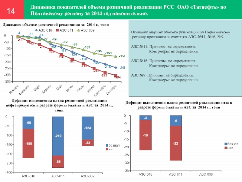 Дефицит выполнения плана розничной реализации нефтепродуктов в разрезе формы оплаты и АЗС за 2014 г., тонн