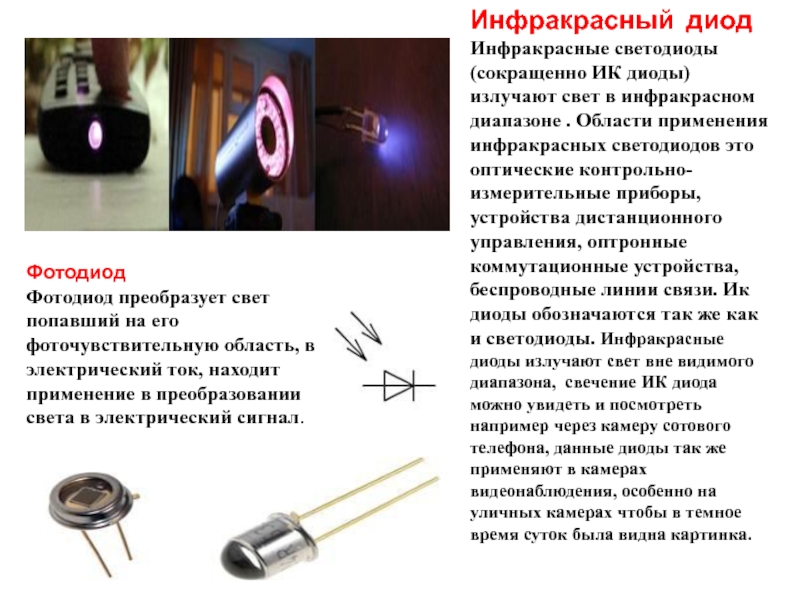 . Области применения инфракрасных светодиодов это оптические контрольно-измерительные приборы, устройства дистанционного управления, оптронные коммутационные устройства, беспроводные линии связи. Ик диоды обозначаются так же как и светодиоды. Инфракрасные диоды излучают свет вне видимого диапазона, свечение ИК диода можно увидеть и посмотреть например через камеру сотового телефона, данные диоды так же применяют в камерах видеонаблюдения, особенно на уличных камерах чтобы в темное время суток была видна картинка.