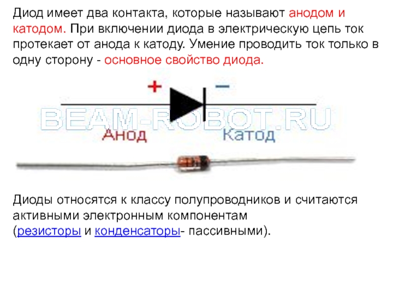 Диоды относятся к классу полупроводников и считаются активными электронным компонентам (резисторы и конденсаторы- пассивными).