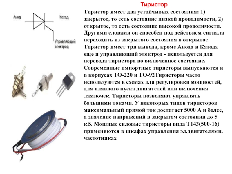 проводимости, 2) открытое, то есть состояние высокой проводимости. Другими словами он способен под действием сигнала переходить из закрытого состояния в открытое. Тиристор имеет три вывода, кроме Анода и Катода еще и управляющий электрод - используется для перевода тиристора во включенное состояние. Современные импортные тиристоры выпускаются и в корпусах ТО-220 и ТО-92Тиристоры часто используются в схемах для регулировки мощностей, для плавного пуска двигателей или включения лампочек. Тиристоры позволяют управлять большими токами. У некоторых типов тиристоров максимальный прямой ток достигает 5000 А и более, а значение напряжений в закрытом состоянии до 5 кВ. Мощные силовые тиристоры вида Т143(500-16) применяются в шкафах управления эл.двигателями, частотниках