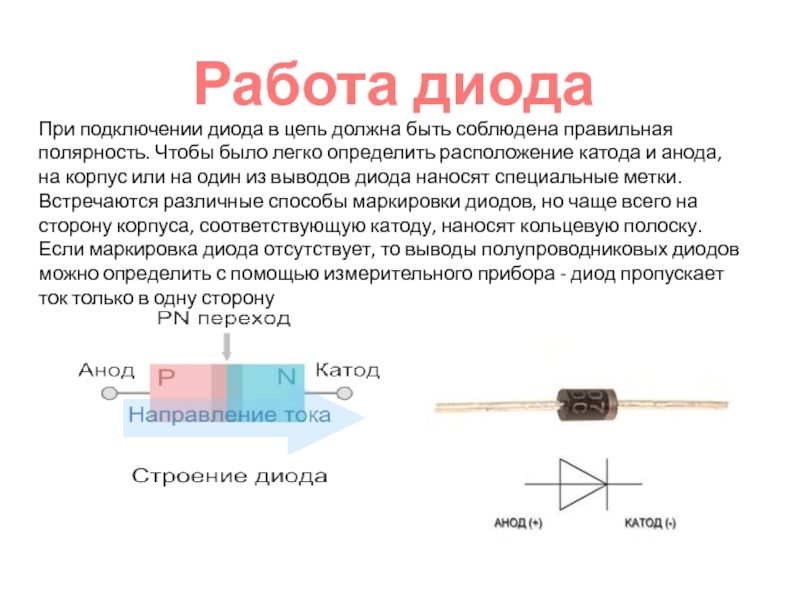 Слайд 8При подключении диода в цепь должна быть соблюдена правильная полярность. Чтобы было легко