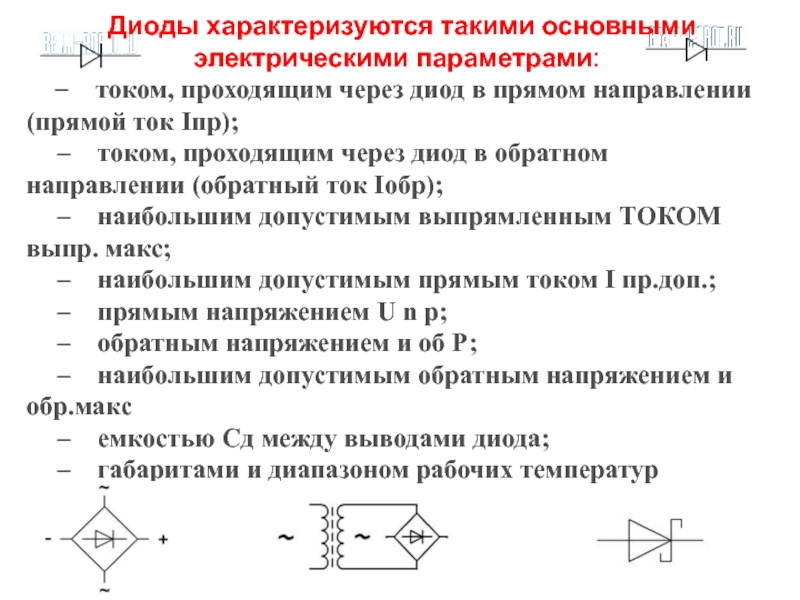 Слайд 7Диоды характеризуются такими основными электрическими параметрами: