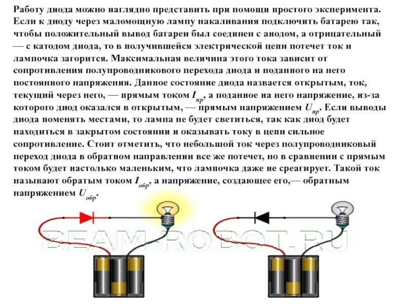 диоду через маломощную лампу накаливания подключить батарею так, чтобы положительный вывод батареи был соединен с анодом, а отрицательный — с катодом диода, то в получившейся электрической цепи потечет ток и лампочка загорится. Максимальная величина этого тока зависит от сопротивления полупроводникового перехода диода и поданного на него постоянного напряжения. Данное состояние диода назвается открытым, ток, текущий через него, — прямым током Iпр, а поданное на него напряжение, из-за которого диод оказался в открытым, — прямым напряжением Uпр. Если выводы диода поменять местами, то лампа не будет светиться, так как диод будет находиться в закрытом состоянии и оказывать току в цепи сильное сопротивление. Стоит отметить, что небольшой ток через полупроводниковый переход диода в обратном направлении все же потечет, но в сравнении с прямым током будет настолько маленьким, что лампочка даже не среагирует. Такой ток называют обратым током Iобр, а напряжение, создающее его,— обратным напряжением Uобр.